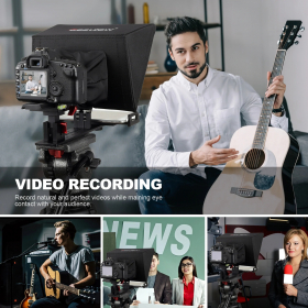 O teleprompter T12 suporta câmaras DSLR de gravação vertical e horizontal e câmaras de vídeo de gravação horizontal;