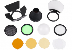Kit acessórios AK-R1 (Cúpula difusora, snoot, filtros gelatinas, grelha de abelha, corta-fluxo, complemento óptico grande ângulo, reflector)